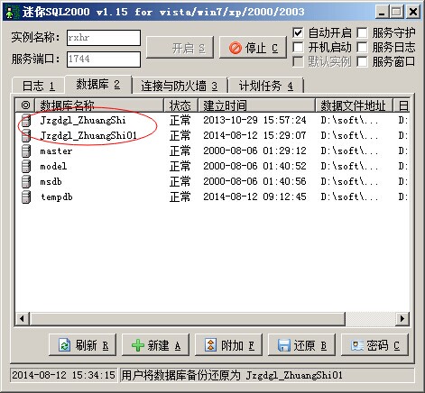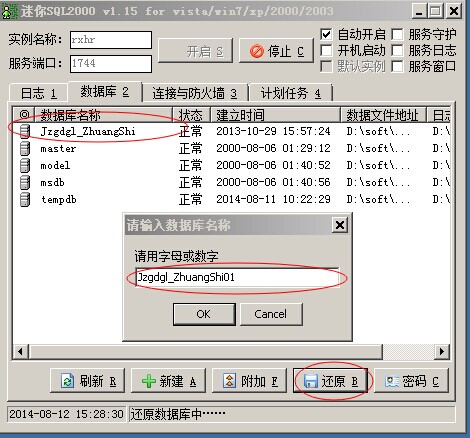2. 數(shù)據(jù)庫還原,還原過程中需要修改數(shù)據(jù)庫名稱,與現(xiàn)有的數(shù)據(jù)庫名稱不同。