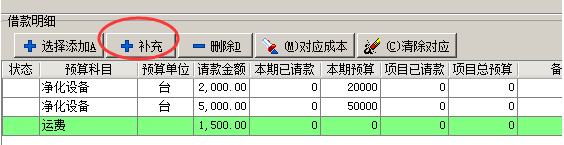 在請款過程中, 如果出現(xiàn)預(yù)算以為的請款,如:運(yùn)費(fèi)、裝卸費(fèi)等,可以利用補(bǔ)充按鈕來進(jìn)行補(bǔ)充。
