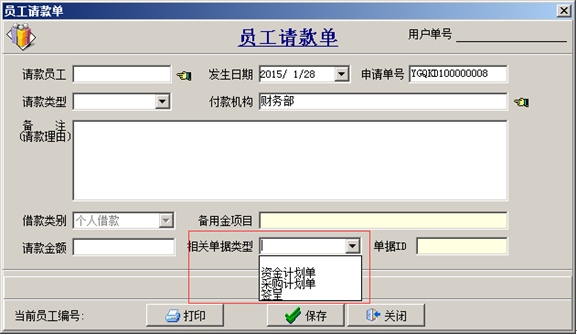 這時(shí)的【員工請款單】較為簡單,只提供了備注、與附件功能,給審核該單據(jù)的管理人員造成了一定的難度。為了解決這一問題軟件改進(jìn)了【員工請款單】給請款單中增加了三個來源:【資金計(jì)劃單】、【采購計(jì)劃單】、【簽呈】,以方便在員工請款審核中,查看請款理由是否合理。其中【采購計(jì)劃單】和【簽呈】是軟件中一直存在的模塊,直接關(guān)聯(lián)的計(jì)劃單號和簽呈單ID。
