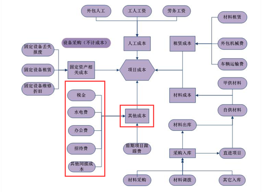 其他成本,是除人工、材料、機(jī)械之外的間接成本。例如:間接的人工費(fèi)(管理人員的福利、養(yǎng)老保險(xiǎn)等)、間接材料費(fèi)(低值易耗品等)前期項(xiàng)目跟蹤費(fèi)(招投標(biāo)費(fèi)等)、辦公費(fèi)(項(xiàng)目部辦公用品等)、業(yè)務(wù)費(fèi)、稅金等各種其他間接成本。