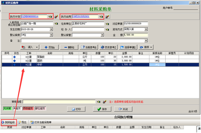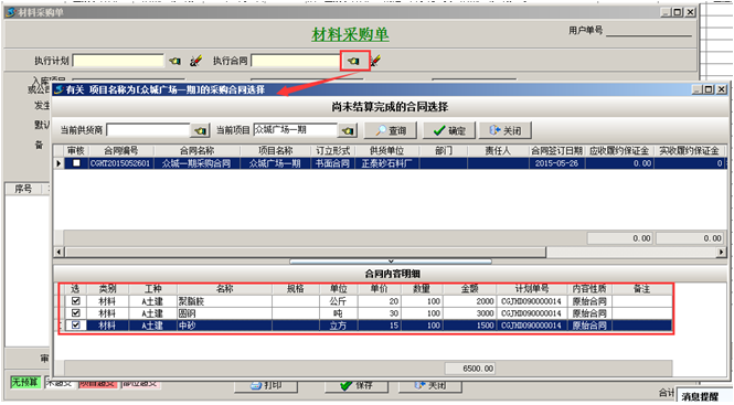 第四步,材料到貨之后,可在【材料管理】模塊,做“材料采購單”,選擇材料的時候,選擇“執(zhí)行合同”,在合同明細里面添加到貨內(nèi)容。如圖: