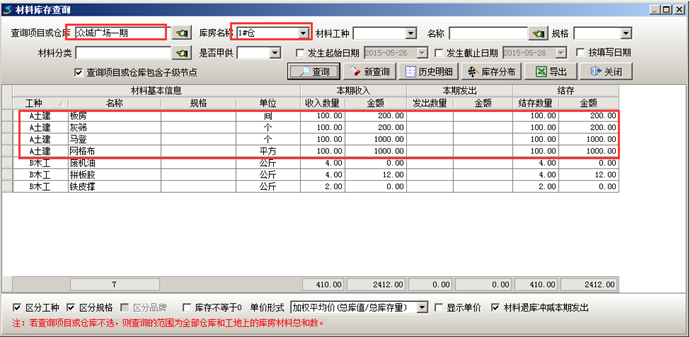 執(zhí)行完成工程項目材料采購流程之后可在對應(yīng)的倉庫中查詢到對應(yīng)的材料庫存,如圖: