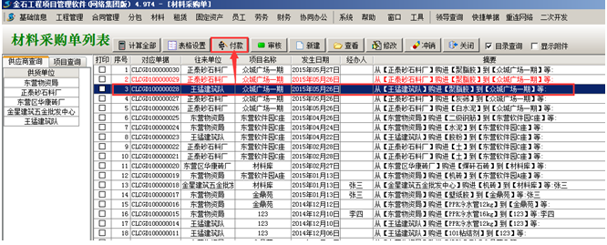 在工地現場材料管理過程中,如果沒有采購合同,材料采購入庫之后,可在“材料入庫單”列表里面,選中單據,直接點擊[付款]按鈕,添加[付款申請單],執行付款。如圖: