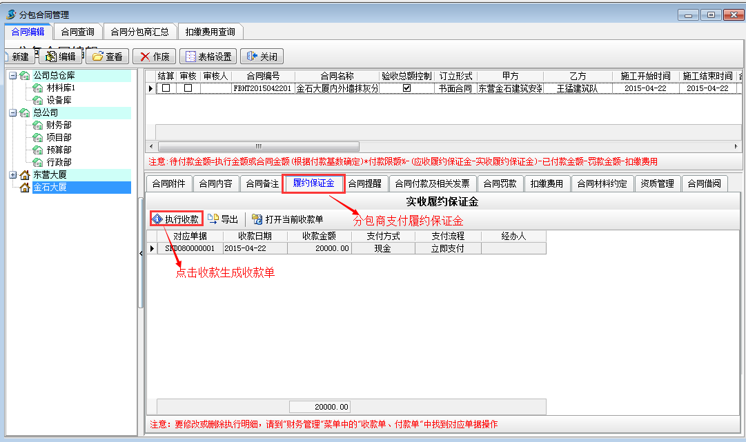 在工程項(xiàng)目分包管理中填寫完合同罰款后會在待付款中自動扣除。
