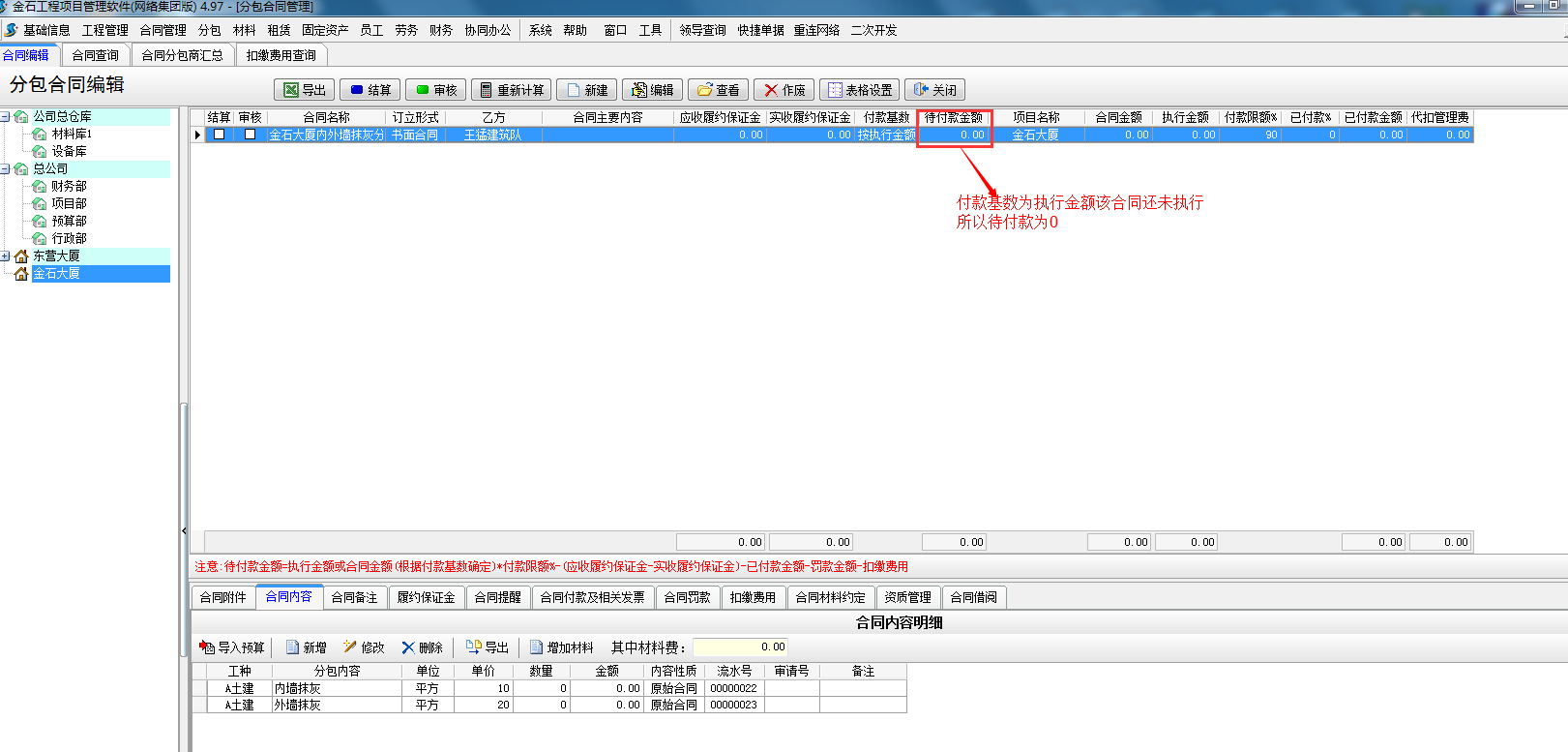 上圖帶紅框的注意填寫正確,其中帶*為必填項(xiàng)。尤其注意【付款基數(shù)】、【付款限額】這些項(xiàng)都會直接影響到該合同的待付款。