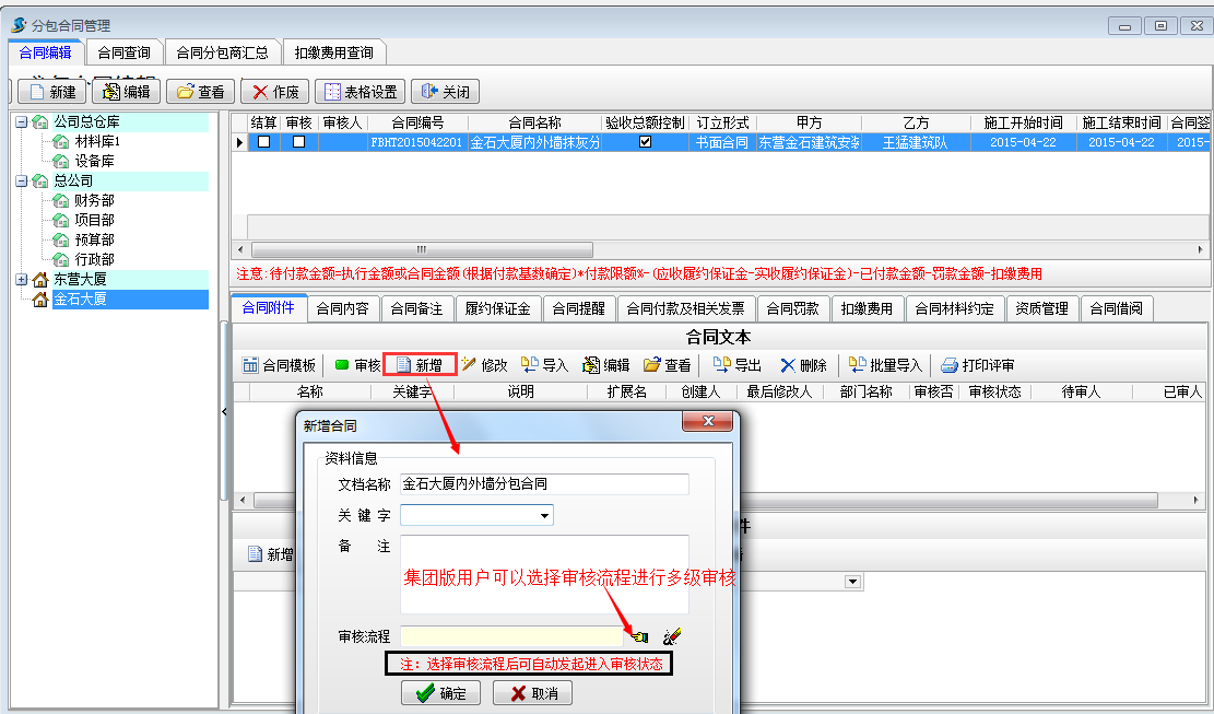 選中[金石大廈]項(xiàng)目點(diǎn)擊【新建】來建立一個合同,界面如下:
