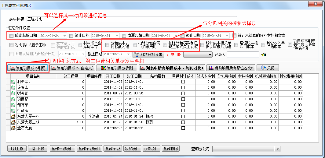 查詢成本方法:在【工程管理】模塊?【項(xiàng)目成本利潤】選好匯總項(xiàng)目生成項(xiàng)目成本列表。如下圖
