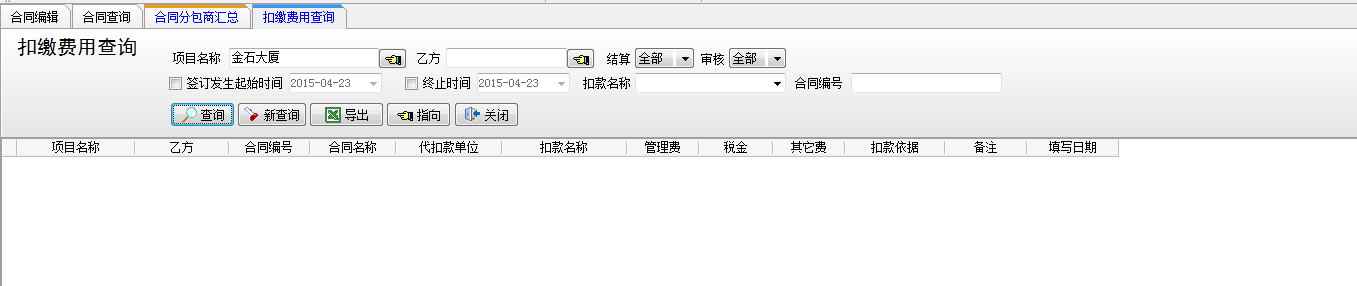 工程項(xiàng)目分包管理合同 是與分包商或施工隊(duì)簽訂的合同,包括【合同編輯】、【合同查詢】、【合同分包商匯總】、【扣繳費(fèi)用查