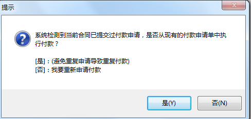 在合同付款及相關(guān)發(fā)票處點(diǎn)擊付款生成付款申請單,系統(tǒng)會自動提示你已有預(yù)付款。
