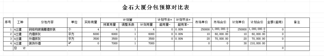 備注:調(diào)整系統(tǒng)說明:在實(shí)際的工程量投標(biāo)中,某些施工企業(yè)為了中標(biāo)而做低預(yù)算量,還有其它的原因如:一些分包根據(jù)以往的施工經(jīng)驗(yàn)總會有一定的偏差。這里用調(diào)整系數(shù)是為了將最終要參與比較的【計(jì)劃用量】、【計(jì)劃用量】調(diào)整到接近于預(yù)期最真實(shí)的值。