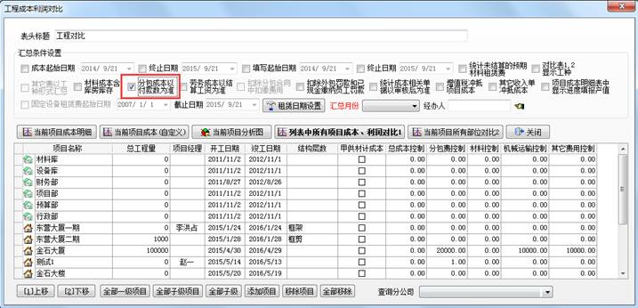 (3)【分包預(yù)算與實(shí)際對比表】是項(xiàng)目的分包預(yù)算單與實(shí)際發(fā)生的分包進(jìn)行量價的對比。對比窗口界面設(shè)置如下