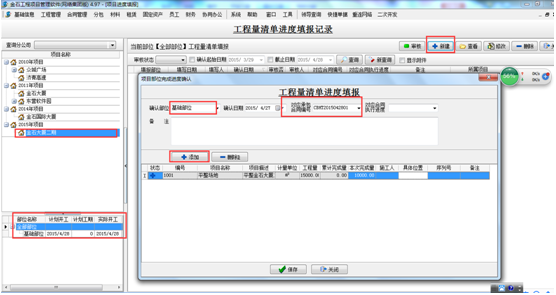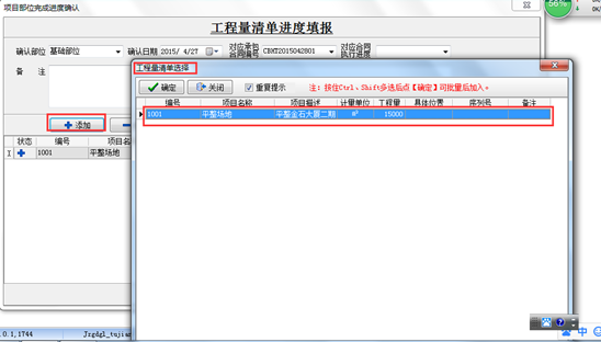 然后點“添加”按鈕,在彈出的“工程量清單選”窗口中選擇需要填報的清單內容,然后在本次完成量處輸入已完成的工作量,如圖: