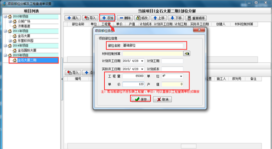 如下圖所示,在彈出的“項目部位分解及工程量清單設置”窗口中點“添加”按鈕,然后依次填寫項目部位名稱、工程量、單位等相關信息,