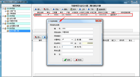 點當前部位的工程量清單設置下面的“添加”按鈕,在彈出工作清單編輯窗口,依次錄入內容,然后保存。