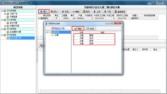 1. 添加項目部位,首先打開“工程管理”中的“部位分解及工程量清單”模塊,根據本文開頭的表格資料錄入軟件中。