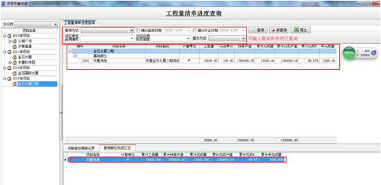 2.選中相應的項目,點查詢,查看工程量清單進度。也可輸入查詢條件進行查詢,如圖: