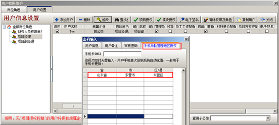 如果用戶有手機考勤管理地區(qū)授權,則點擊“手機考勤管理地區(qū)授權”,輸入被授權的地址,則用戶會有權限查看被授權地區(qū)的員工考勤信息。