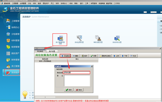 進入系統(tǒng)的“系統(tǒng)維護”點擊“用戶管理權限設置”,彈出“用戶權限維護”的對話框,點擊“崗位角色”-“添加角色”彈出“添加角色”的對話框,在角色名稱的文本框里面輸入“角色名稱”點擊保存的按鈕,如圖: