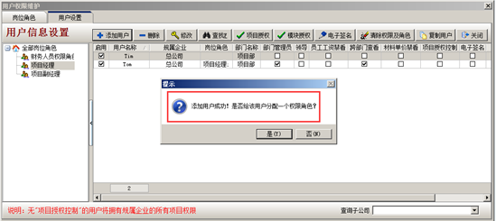“用戶添加”完成后系統(tǒng)提示添加用戶完成,是否給用戶分配權限角色,如圖: