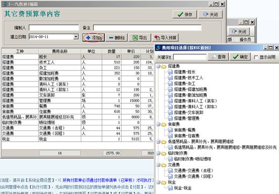 在預(yù)算單中,點(diǎn)【添加】按鈕就會(huì)彈出之前設(shè)定好的科目,以供我們選擇使用。添加完成后,點(diǎn)保存按鈕進(jìn)行保存。保存完成后,我們可以在工程管理模塊【項(xiàng)目維護(hù)】中進(jìn)行預(yù)算與項(xiàng)目綁定。