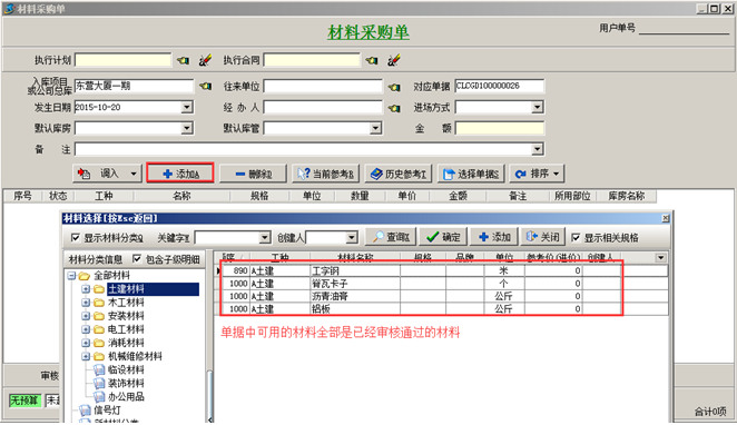 審核通過的“材料信息”可在系統業務單據中可用,如圖: