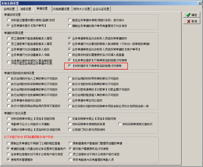 在“系統維護”-“用戶管理權限設置”給具有材料審核權限的用戶分配權限,如圖:
