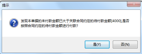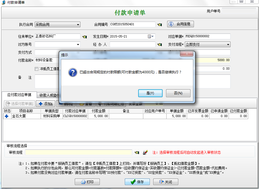 當(dāng)我們選擇是時,生成付款為4000的付款申請單;當(dāng)選擇否時,生成5000的付款申請單,當(dāng)保存單據(jù)時軟件也會提示超過了付款限額。如圖