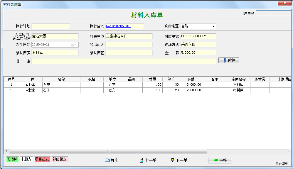 我們對該合同進(jìn)行驗(yàn)收,生成材料采購單,如下圖