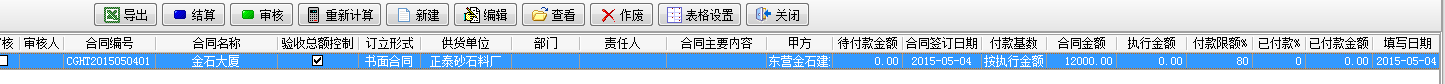 我們建立一個總價為12000的采購合同,付款基數(shù)按執(zhí)行金額,付款限額為80%。如下圖