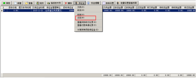我方要從“保證金管理單位”將投標(biāo)保證金收回。工程管理軟件的項(xiàng)目開拓中選中對(duì)應(yīng)的項(xiàng)目,在“保證金”菜單中選擇“收回”,如圖所示: