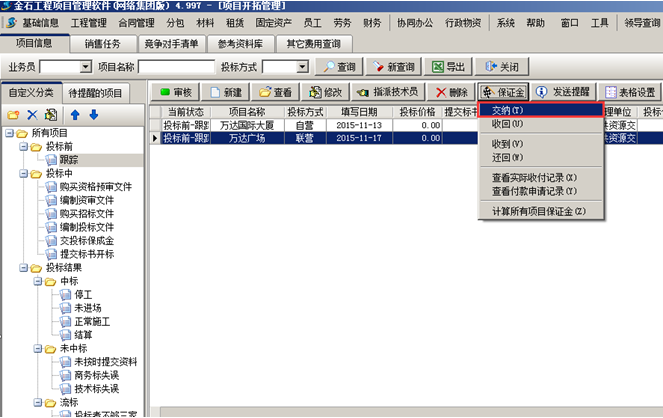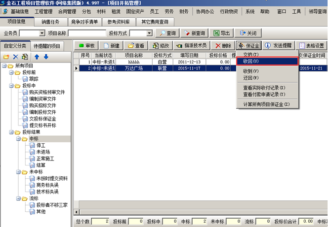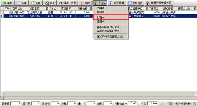 掛靠單位將投標(biāo)保證金交給我方。我方在工程管理軟件的項(xiàng)目開拓列表中找到對(duì)應(yīng)項(xiàng)目,在“保證金”菜單中點(diǎn)擊“收到”,如圖: