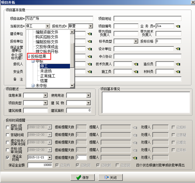 項(xiàng)目狀態(tài)編輯維護(hù)完成之后可在工程管理軟件中建立項(xiàng)目。在工程管理軟件的“項(xiàng)目開拓”中輸入包括個(gè)往來單位以及負(fù)責(zé)人等項(xiàng)目基本信息。也可在投標(biāo)時(shí)間提醒里面設(shè)置“招標(biāo)(資審)時(shí)間”,“答疑時(shí)間”,“提交標(biāo)書時(shí)間”,“開標(biāo)時(shí)間”,“保證金”提醒時(shí)間,時(shí)間設(shè)置完成之后,被提醒的用戶會(huì)在相應(yīng)的時(shí)間收到相關(guān)的提醒內(nèi)容。投標(biāo)保證金,在投標(biāo)保證金對(duì)應(yīng)的復(fù)選框打鉤,設(shè)置投標(biāo)保證金的時(shí)間,提前提醒的天數(shù),被提醒人以及金額。如圖所示: