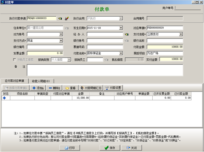 交納投標(biāo)保證金時(shí)填寫“付款申請(qǐng)單”或者“付款單”,(如果填寫的是付款申請(qǐng)單則在付款申請(qǐng)單審核通過之后進(jìn)行付款),如圖: