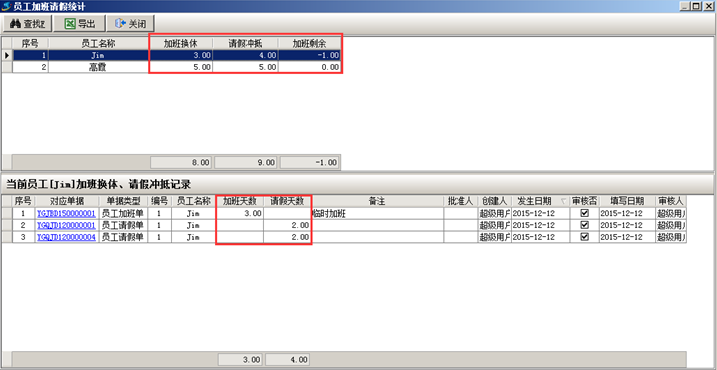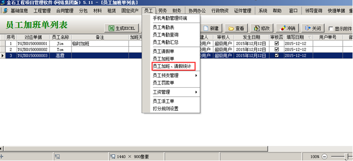 員工加班請假統計情況可在工程管理軟件中進行查詢,如圖: