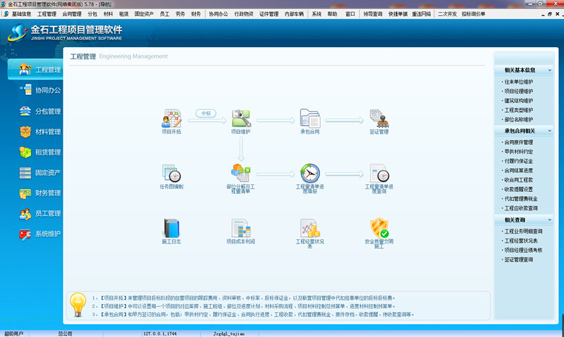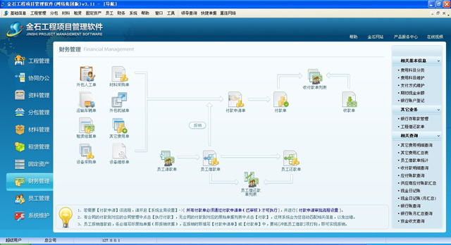 本軟件是金石軟件公司以眾多施工企業(yè)管理現(xiàn)狀為出發(fā)點,深入了解施工現(xiàn)場,經(jīng)過七年地不斷完善與努力,打造成為一款成熟、靈活、實用性極高的信息化內(nèi)控管理平臺。軟件以成本控制為核心,以資金管理為主線,全面解決項目管理難題,提升項目管控能力。對工程的投標管理、中標后的進度管理、分包管理、采購招標、材料管理、租賃管理、固定資產(chǎn)管理、員工管理、勞務(wù)管理、資金管理、押金管理、發(fā)票管理、稅金核算、聯(lián)營管理、文檔資料管理、物資管理、安全質(zhì)量管理、證件管理、車輛管理、工程結(jié)算、等進行全方位管理,并提供強大的OA功能,能夠?qū)崿F(xiàn)各部門之間的數(shù)據(jù)共享及業(yè)務(wù)單據(jù)網(wǎng)上簽批審核。并且提供了強大的自定義工作流驅(qū)動和各種流程開關(guān),企業(yè)可根據(jù)自己情況自行設(shè)定,從而規(guī)范企業(yè)管理、讓工作流程正歸化、簡單化。通過工作流,讓信息送審、審批更貼近日常公司管理模式,申請人可隨時看到當前業(yè)務(wù)的審批進度和各領(lǐng)導(dǎo)的審批意見。