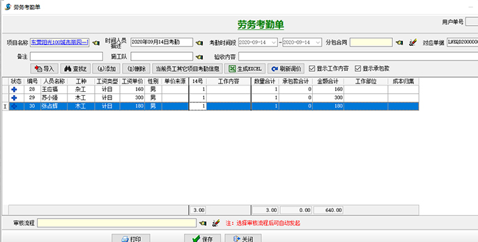 1、項目部以【勞務考勤單】為勞務進出場的日報,需每日完成。月底根據【勞務考勤單】生成月度工資表進行結算