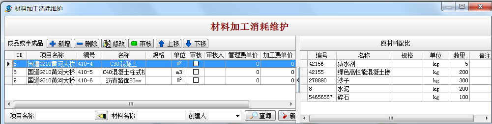 在實(shí)際應(yīng)用中,根據(jù)預(yù)算軟件或其他方法獲得的詳細(xì)秘密配方不準(zhǔn)確。在制造實(shí)驗(yàn)過程中獲得的原材料秘密配方可輸入材料成本維護(hù),并根據(jù)準(zhǔn)確的配合比控制材料的數(shù)量和進(jìn)度。