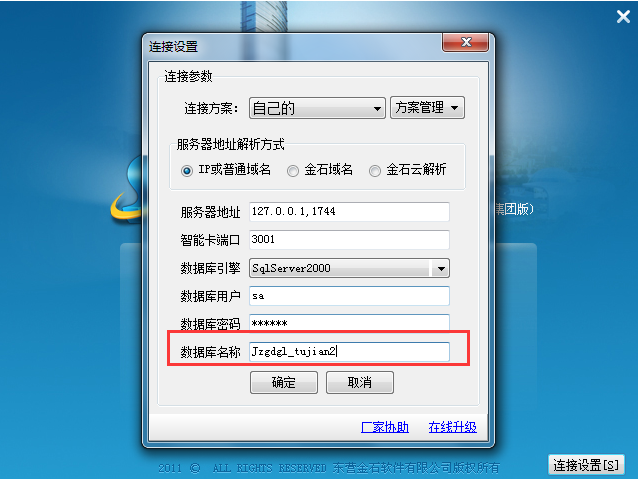 2.打開金石客戶端→連接設(shè)置,更改下數(shù)據(jù)庫名稱為我們還原的數(shù)據(jù)庫名稱Jzgdgl_TuJian2