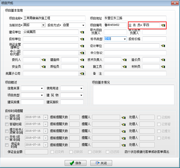 在施工項目管理軟件項目開拓建立開拓項目,【項目開拓】中業務員必須要與【銷售任務】中業務負責人一致。如下圖: