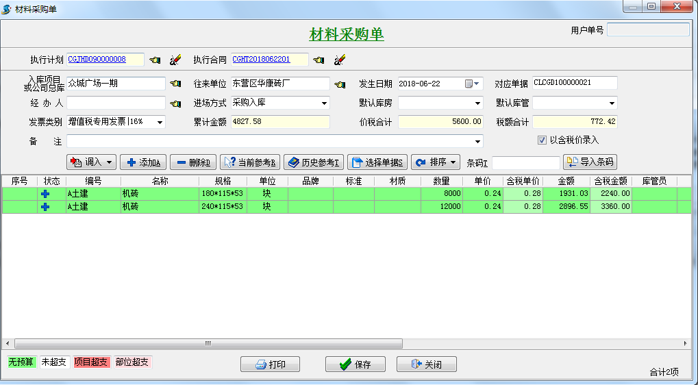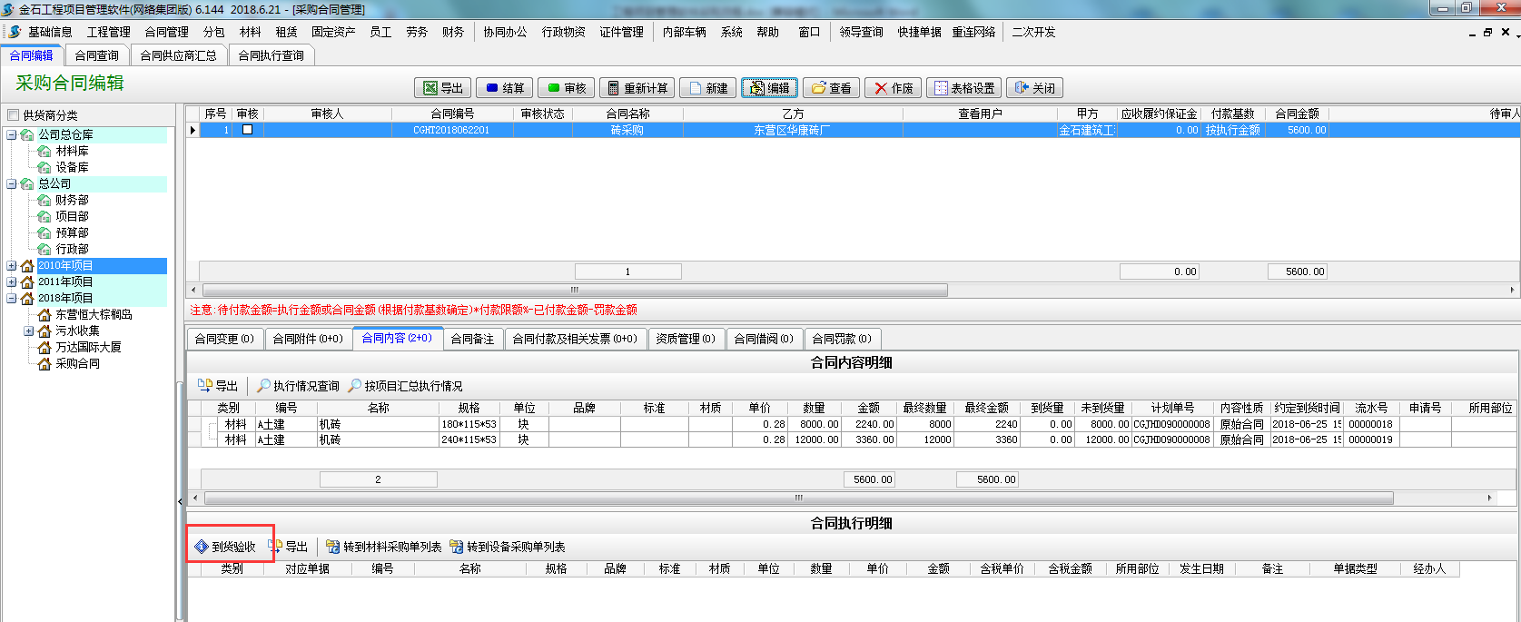 第三步,材料到貨之后,可在采購合同選擇到貨驗收或者直接新建材料采購單選擇執行合同。