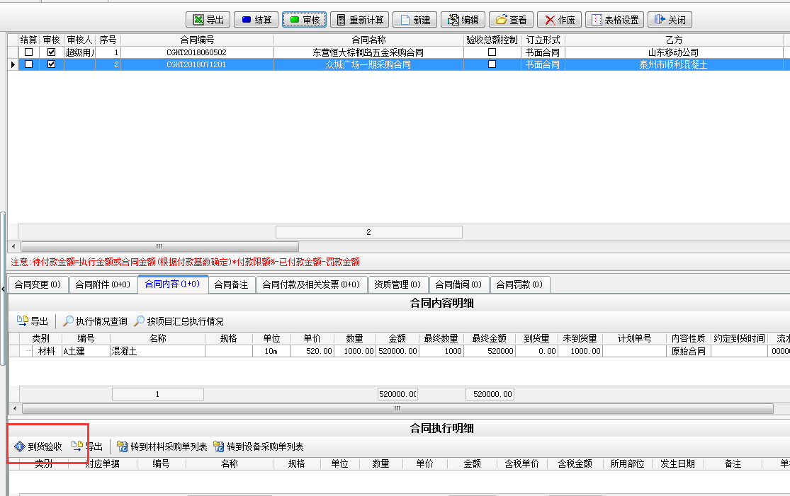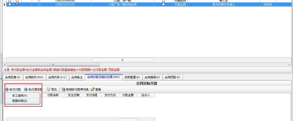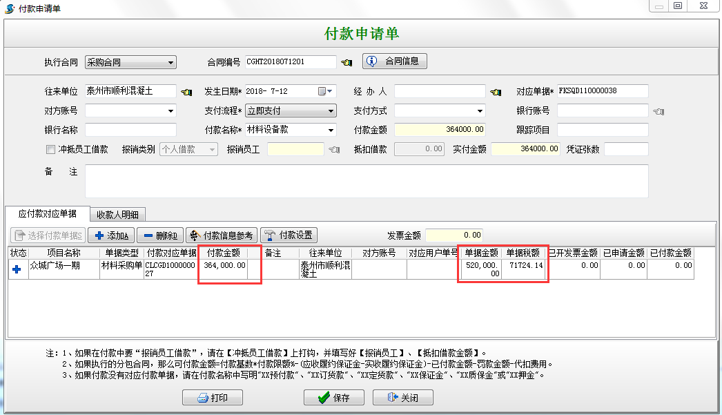 選擇“執(zhí)行付款”根據(jù)向?qū)Ш笙到y(tǒng)會自動根據(jù)材料單據(jù)金額*付款比例,自動得出待付的金額