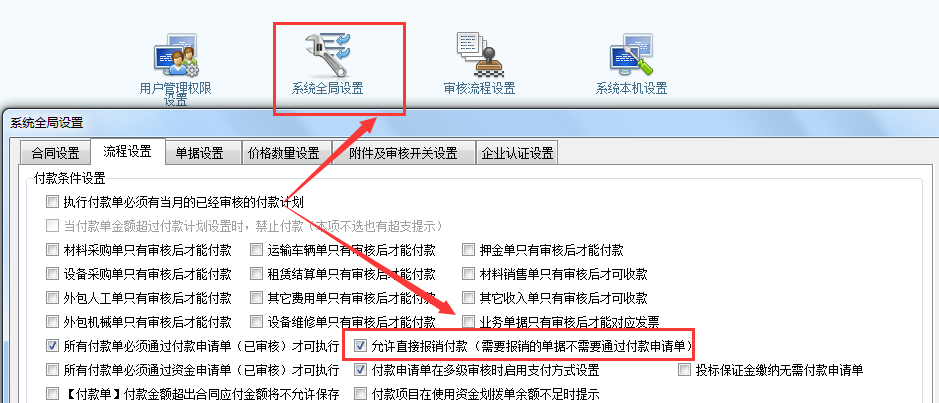 在“系統(tǒng)維護”→“系統(tǒng)全局設(shè)置” 開啟“允許直接報銷付款”