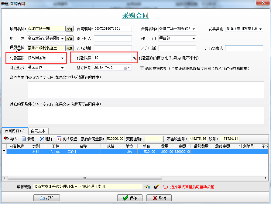 其中付款金額(364000)為合同金額(520000)*付款限額(70%)