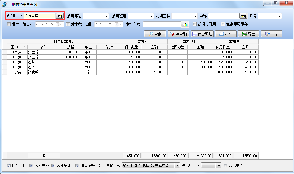 【工地材料用量查詢】是在工地現場材料管理中查詢工地材料用量,在查詢前需要設置查詢項目設置查詢項目為金石大廈,查詢結果如下圖: