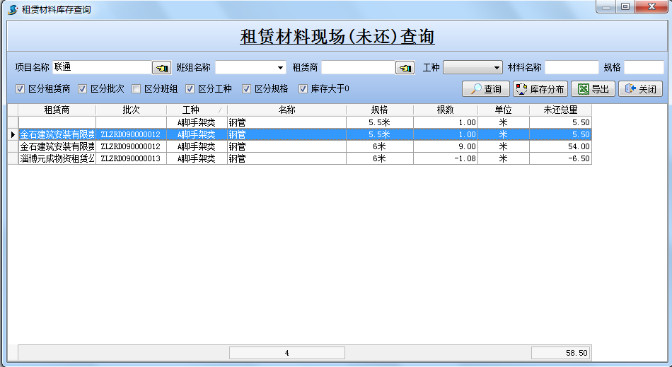 查詢下租賃的庫存可看到一根鋼管的規(guī)格已經(jīng)改變?yōu)?.5米,如下圖: