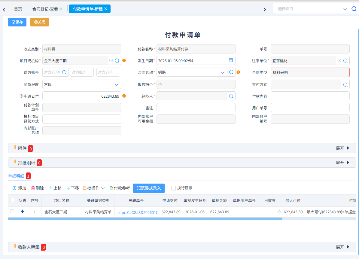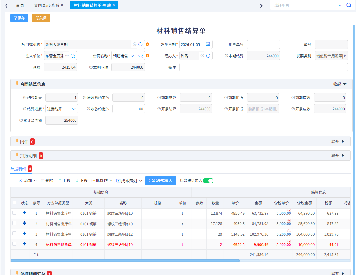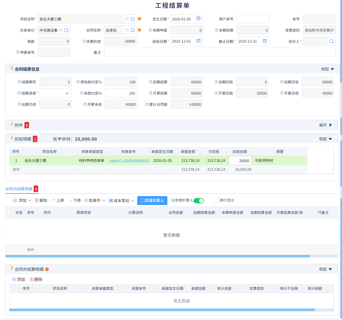 在與甲方結算時會自動扣除甲供材,扣抵金額可以自行輸入,分多次扣抵。