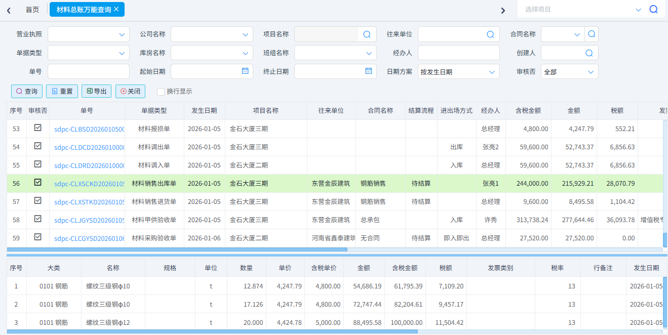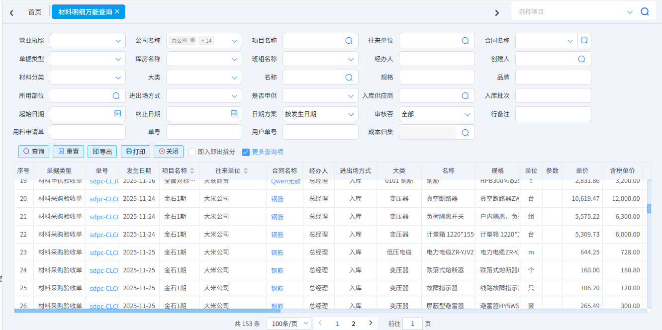 查詢所有類型的材料單據。一般用于材料單據的對賬??梢园凑諉螕愋?、項目名稱、供應商、材料名稱、時間等條件進行篩選??梢詫С鰁xcel表格。