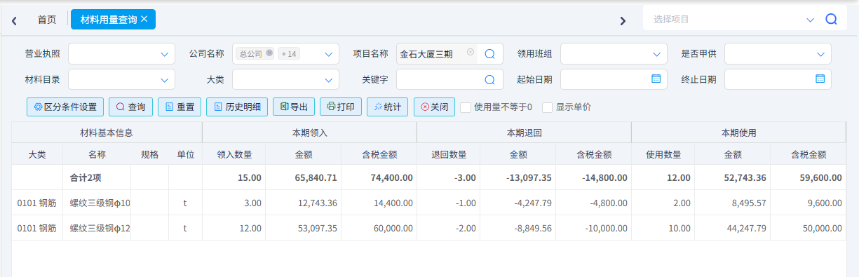 用于查詢公司或者項目材料采購和退貨情況,可以按照公司、項目名稱、供應商、材料名稱、發生日期等條件篩選。