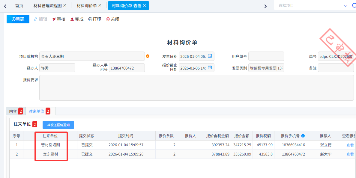 供應商提交報價后,會自動發送短信給公司詢價人,詢價人在系統就可以查看報價并進行比價