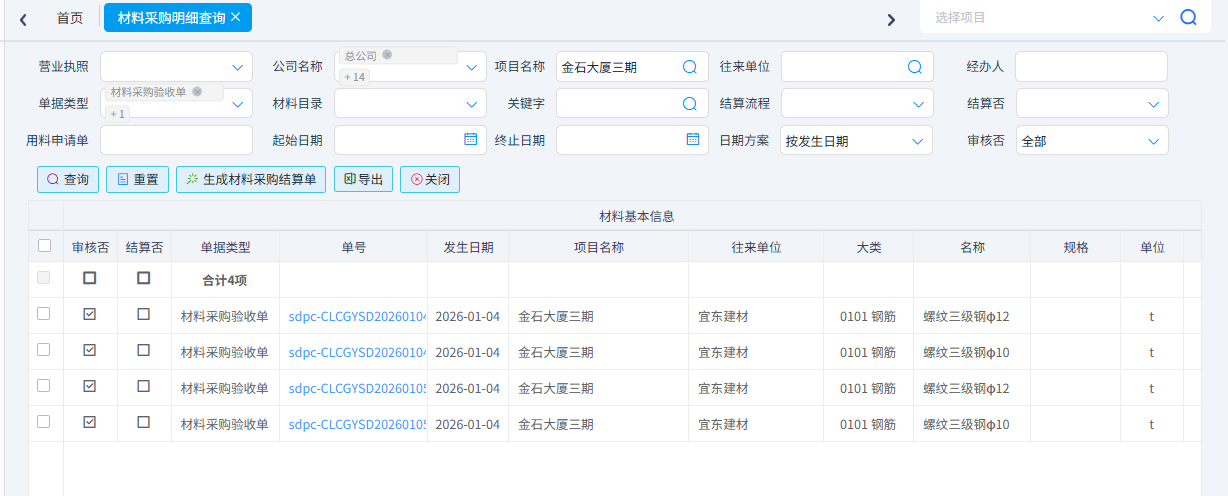 用于查詢所有類型的材料單據的內容明細。該功能可滿足關于材料明細的任何形式任何條件的查詢??梢园凑諉螕愋?、項目名稱、供應商、材料名稱、時間等條件進行篩選??梢詫С鯡xcel表格。